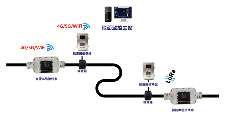 低频电磁耦合式通信装置以电缆金属铠装层/屏蔽层为传输介质,无需单独铺设通信线缆,通过电磁感应耦合实现无接触信号传递。信号经发射端—耦合器—电缆屏蔽层—耦合器—接收端形成闭环,适用于高电磁干扰、小数据量传输场景,可对矿山主干网络进行有效补盲。