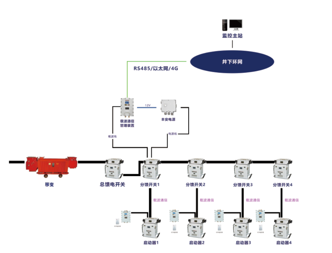 低频电磁耦合式通信装置以电缆金属铠装层/屏蔽层为传输介质,无需单独铺设通信线缆,通过电磁感应耦合实现无接触信号传递。信号经发射端—耦合器—电缆屏蔽层—耦合器—接收端形成闭环,适用于高电磁干扰、小数据量传输场景,可对矿山主干网络进行有效补盲。
